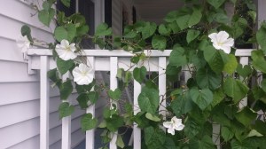 Nine hours can take its toll. So can nine years. So can nine decades. Still, even my grandmother at nearly ninety-two, burdened with dementia, smiles up from her wheelchair. My nephew will smile up from his bed at Gabrielle tomorrow morning. Kyle will smile up at me from his beach towel on our day off on Friday. My colleague will smile up at his students from his desk chair next week. And I’m smiling up at my evening glories from my white wicker perch now.
