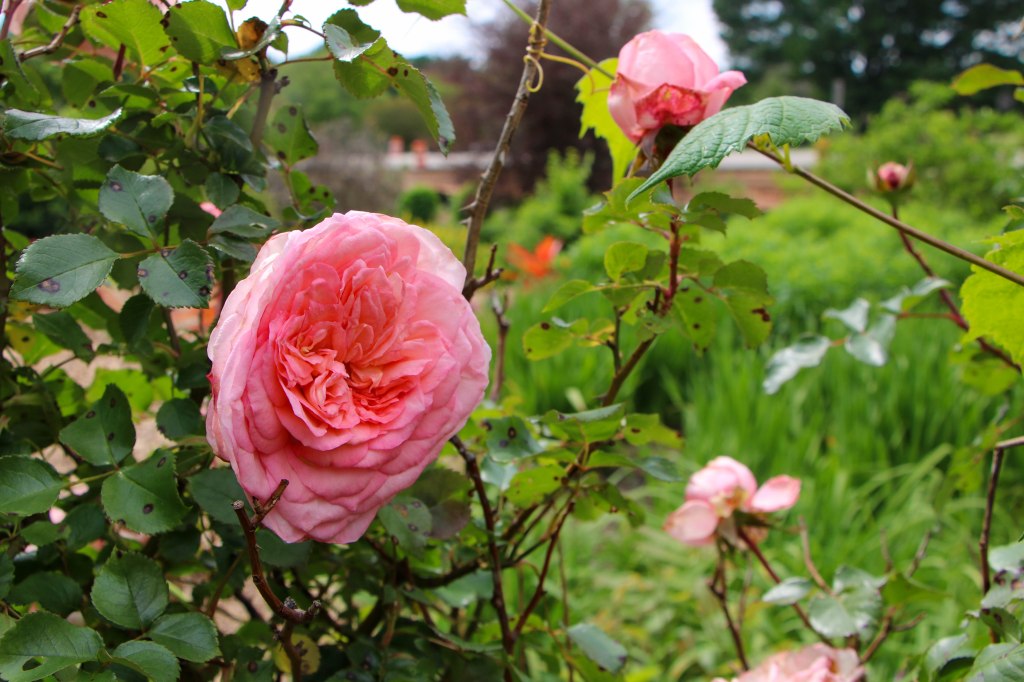 The plant that most excited me on our excursion was the Hybrid Tea Rose. The bush grows two types of flowers. Apparently, it was created in France in the 1800s by crossing the hybrid perpetual rose with the tea roses we see in flower arrangements. Each rose was called separately by another name, but the DNA could be altered so that one bush could grow two types of flowers.