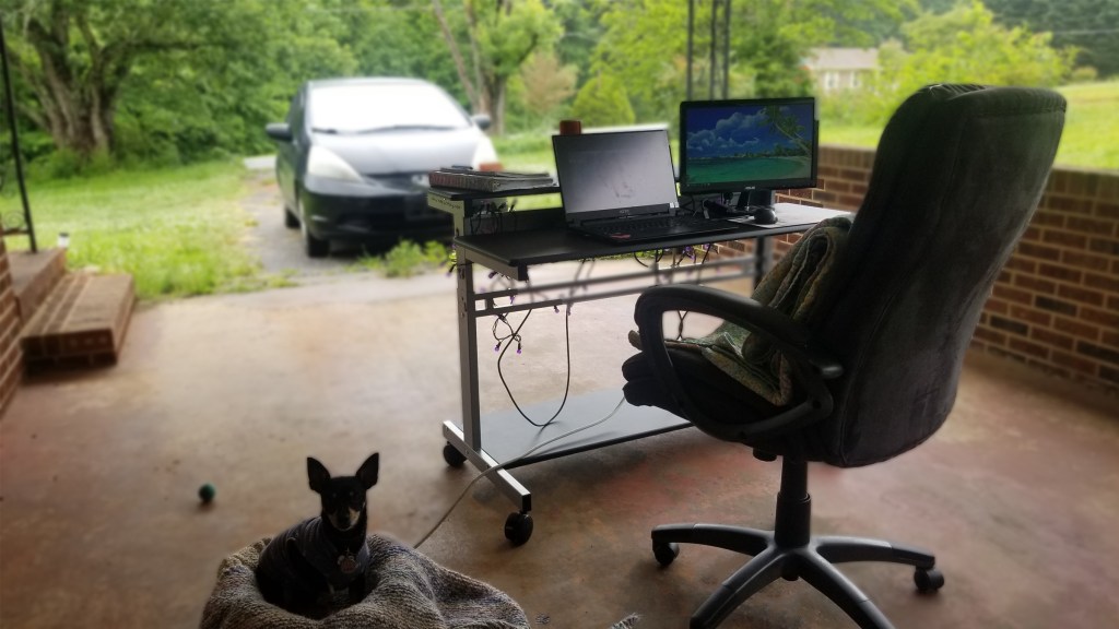 Welcome to my new and improved writer’s perch. Not only is it twice the size of my study indoors, but it provides sufficient shade cover and rain protection 24 hours a day, unlike the porch and patio.