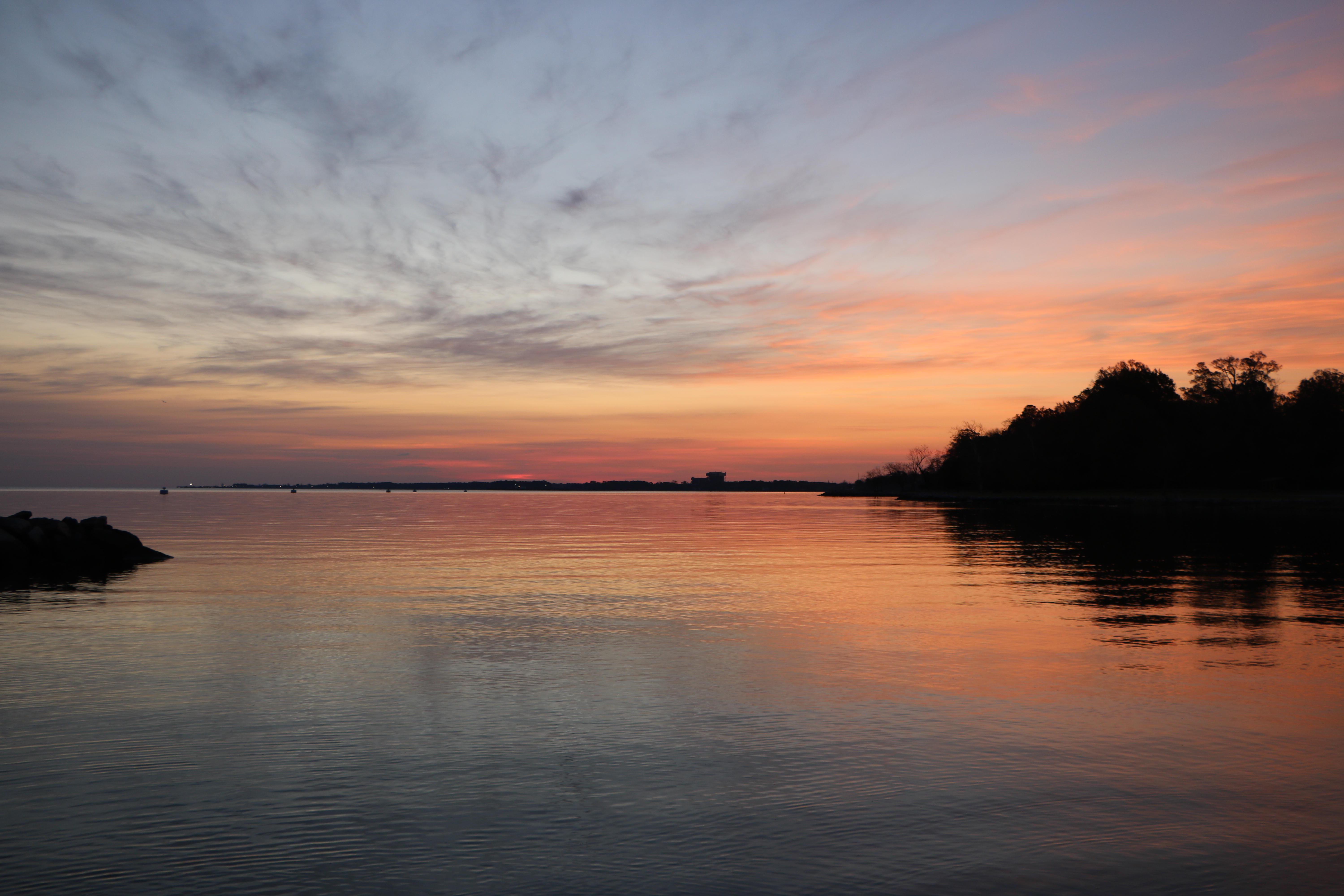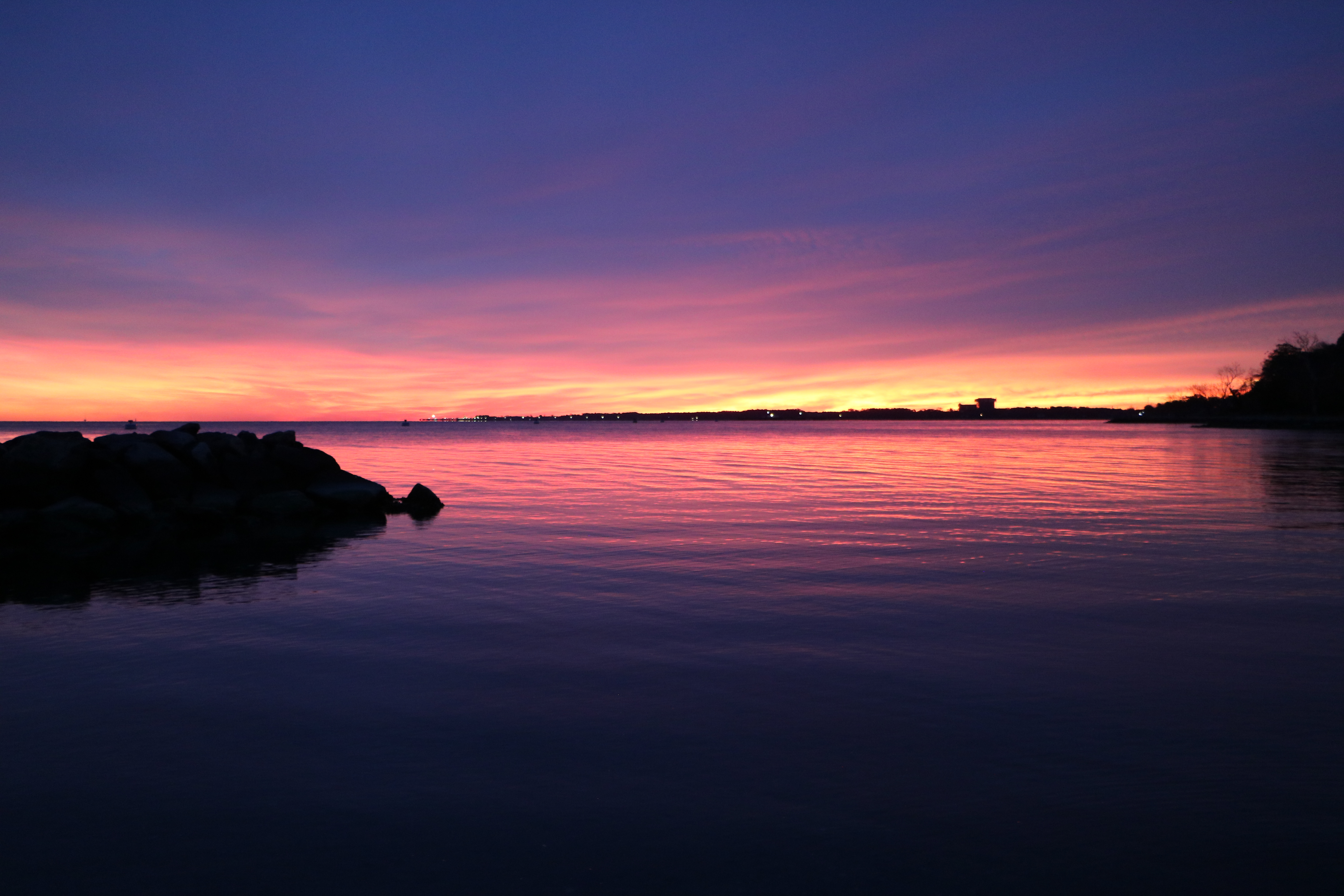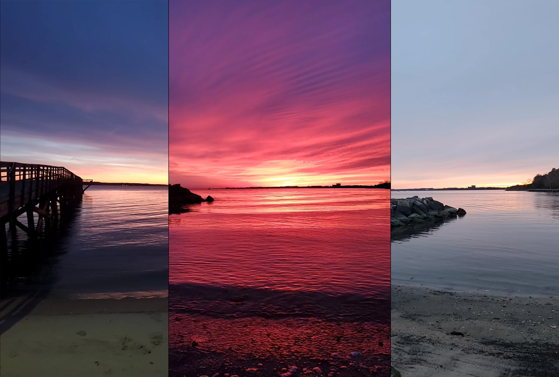 When I pulled my spiral journal out, the scripture on the cover spoke on behalf of Yorktown Fishing Pier: “Be still and know that I am God.” I was still. I was aware of nothing more or less. God was in the sunrise, deepening lavender clouds with pink highlights, mirroring sky in sea, draping me in dawn. Were it not for timestamps, I would have guessed these photos captured merely four minutes apart were taken on different days entirely.