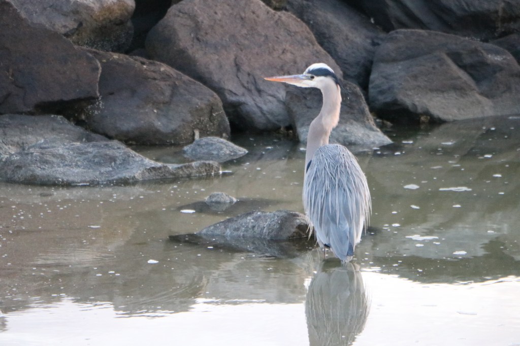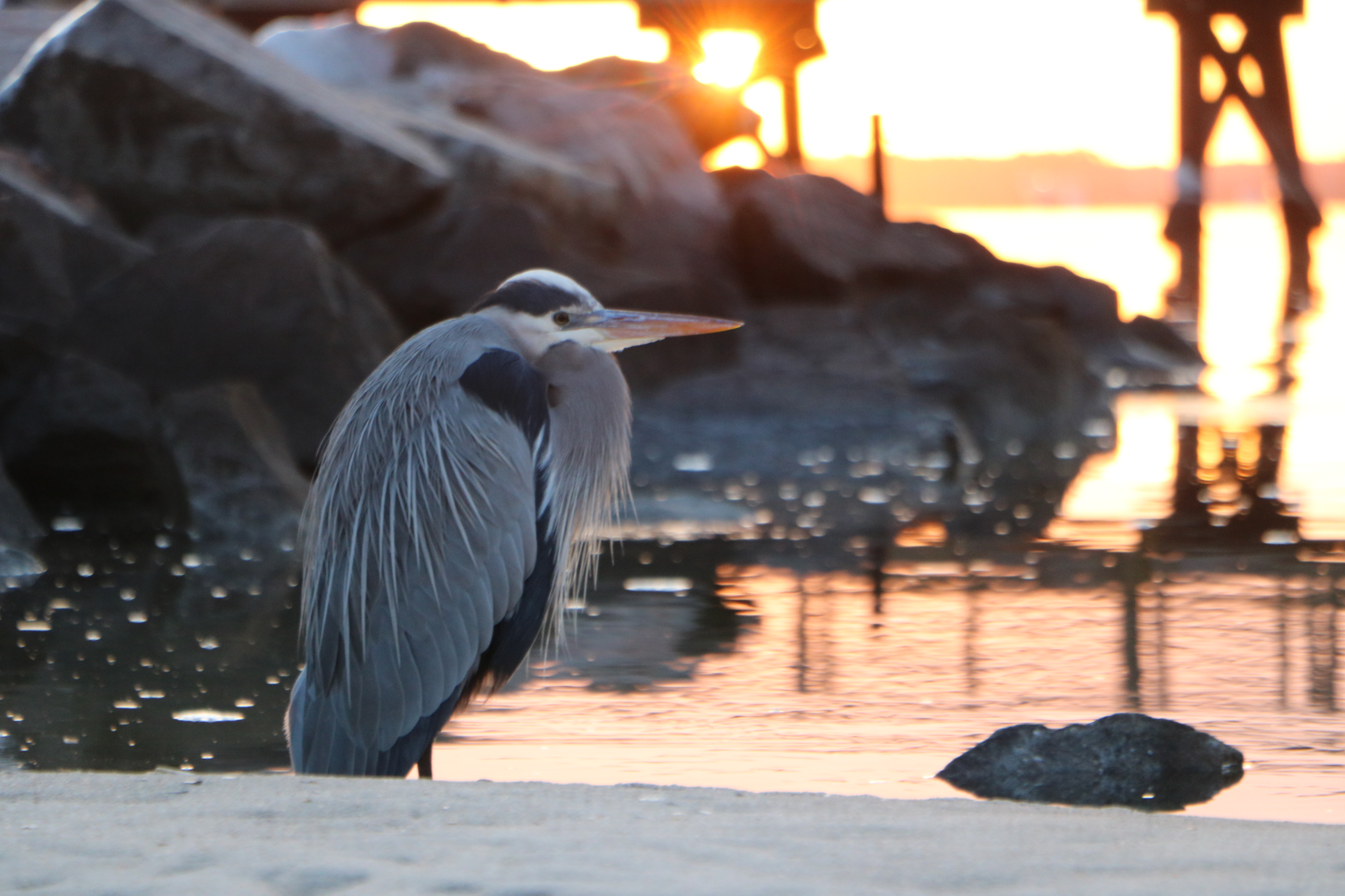 But today, when my blue heron showed up at the jetty on the far side of the pier — after a week and a half’s absence — Kevin called across the beach to me.