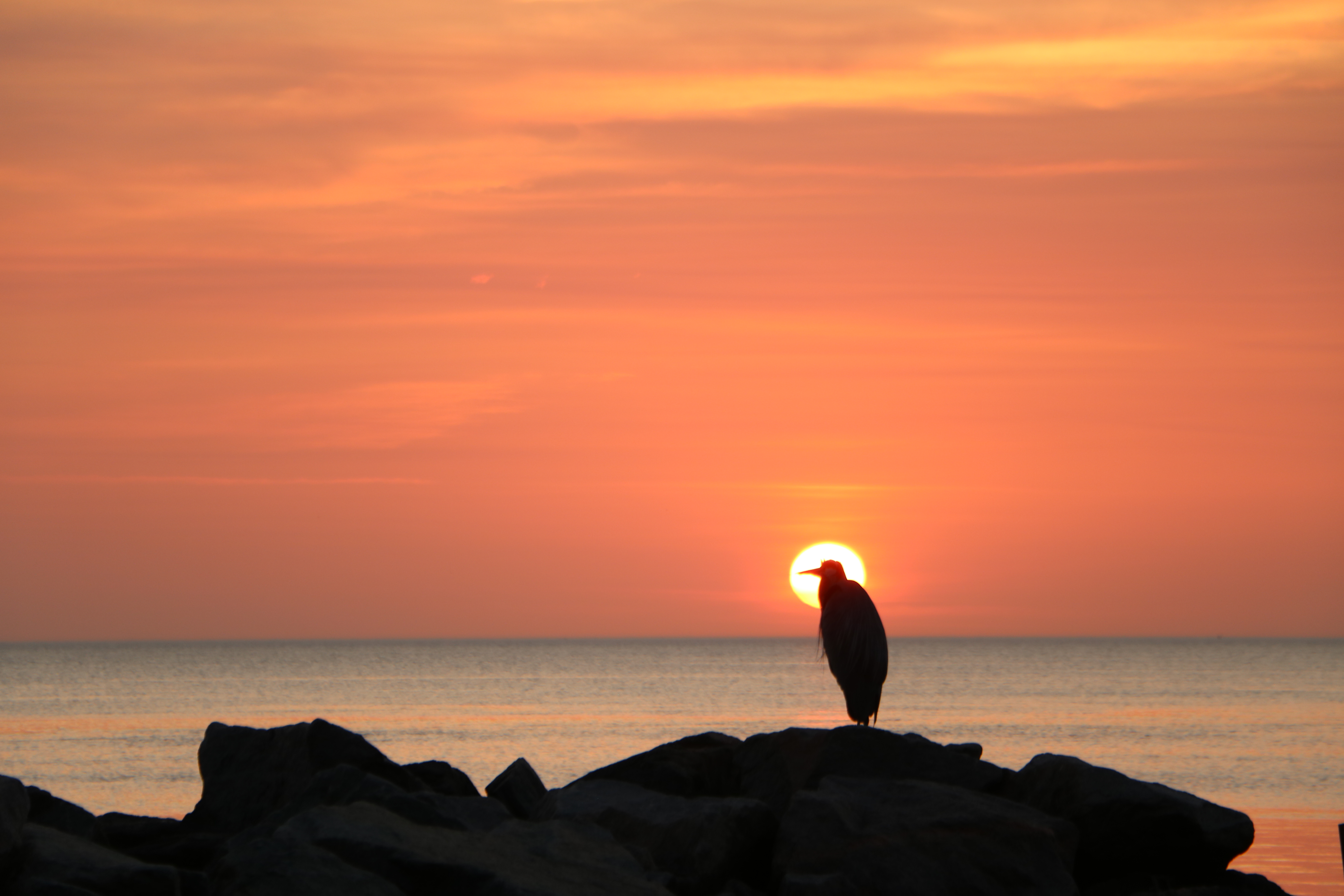 Mama Marci painted the sunrise in watercolor last week. I’ll frame it, and it can join her painting of my blue heron. Kevin took our picture at the pier. Mary Beth’s dog is asleep on my couch beside me as I type. The heron was in the jetties this morning, camouflaged but unmistakable. Nothing is wasted.