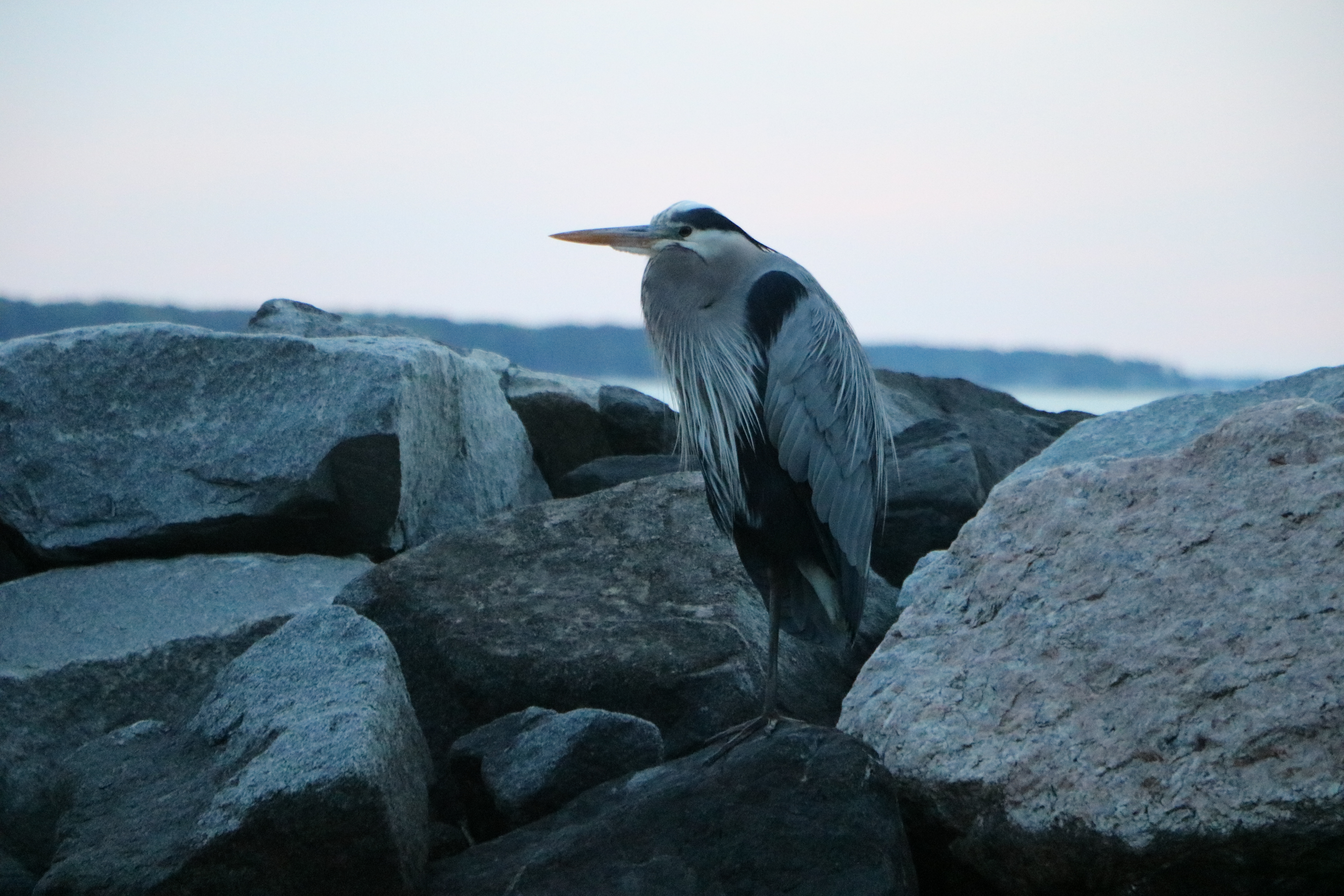 My heron was hiding in the jetties. I spotted him right away, camouflaged in the rocks, but those twig legs were unmistakable even at a distance. Marci couldn’t see him. I pointed. She squinted. She trusted me.