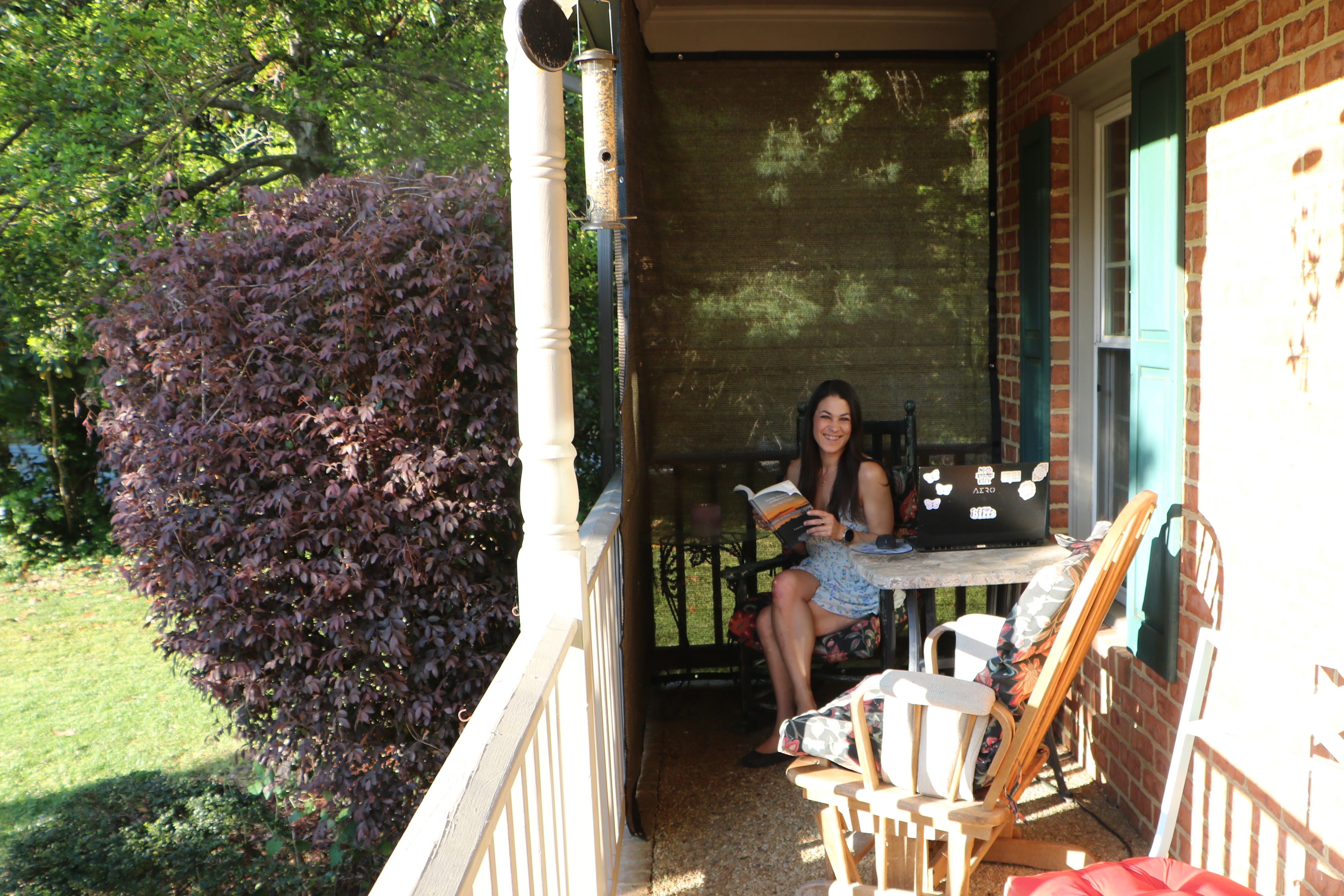 I’ve been missing my writer’s perch at my little bungalow in downtown Hampton lately. This weekend, I created a new one on my front porch in Yorktown. I installed a privacy screen in the far corner to give me enough shade to work on my laptop at any time of day. I swept out the cobwebs and the wasp nest and the leaves. I washed the patio cushions. I wiped down the shutters and hosed the pollen off the furniture. I refilled the bird feeders and rehung my butterfly wind chimes.